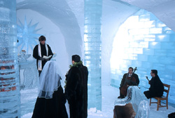 Share the fairytale bliss that unfolds each winter when wedding vows are exchanged or renewed in our spectacular and pristine chapel. As heavenly rays of sunlight filter through crystalline walls of ice, the words “ wedding in white” take on new meaning. |